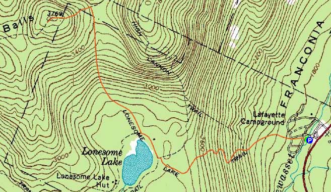 Directions to trailhead: Take I-93 South to the Lafayette Place exit. The Lonesome Lake Trail starts on the foot bridge at the hiker parking lot.