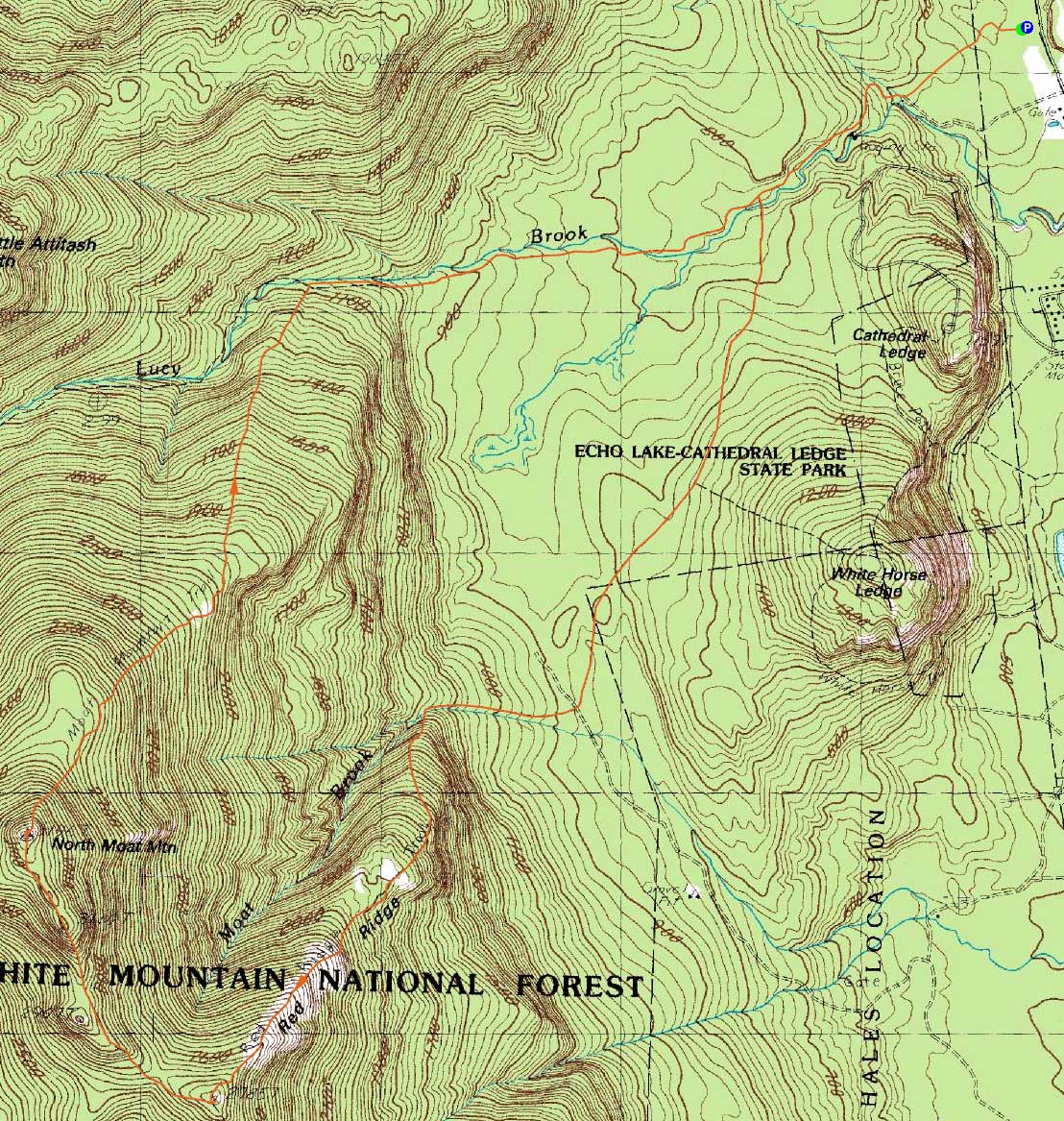 Directions to trailhead: From Conway, take West Side Road northwest to the Diana's Bath WMNF fee parking lot. The Moat Mountain Trail starts at the back of the parking lot.