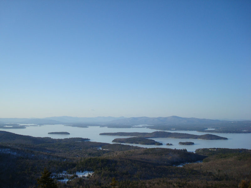 Looking across a still-frozen Lake Winnipesaukee at the Sandwich and Ossipee Ranges from the summit of Mt. Major