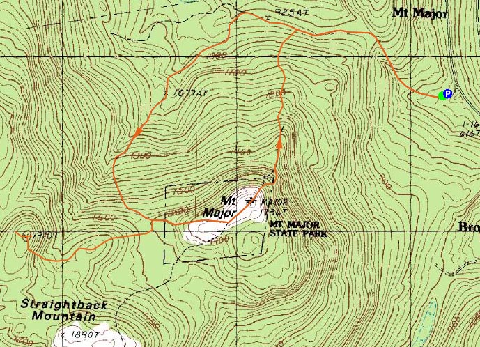 Route: Mt. Major Trail, Brook Trail, Major/Straightback Link, Quarry Spur Trail, Quarry Trail, (North Straightback Mountain), Quarry Trail, Quarry Spur Trail, Major/Straightback Link, (Mt. Major), Mt. Major Trail