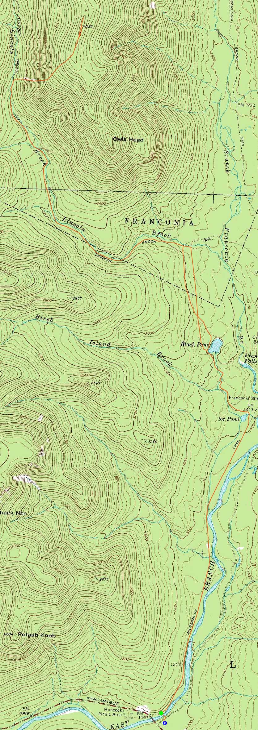 Route: Lincoln Woods Trail, Black Pond Trail, bushwhack, Lincoln Brook Trail, Owl's Head Path, (formerly recognized Owl's Head summit), bushwack, (Owl's Head), buswhack, Owl's Head Path, bushwhack, Lincoln Brook Trail, bushwhack, Black Pond Trail, Lincoln Woods Trail