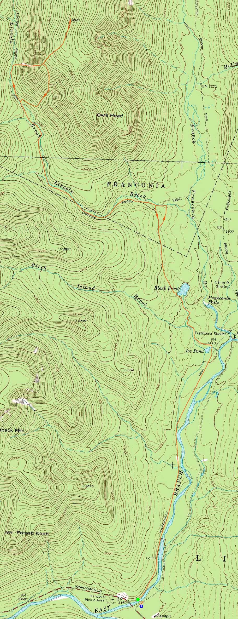 Route: Lincoln Woods Trail, Black Pond Trail, bushwhack, Lincoln Brook Trail, Owl's Head Path, (formerly recognized Owl's Head summit), bushwack, (Owl's Head), buswhack, Owl's Head Path, bushwhack, Lincoln Brook Trail, bushwhack, Black Pond Trail, Lincoln Woods Trail