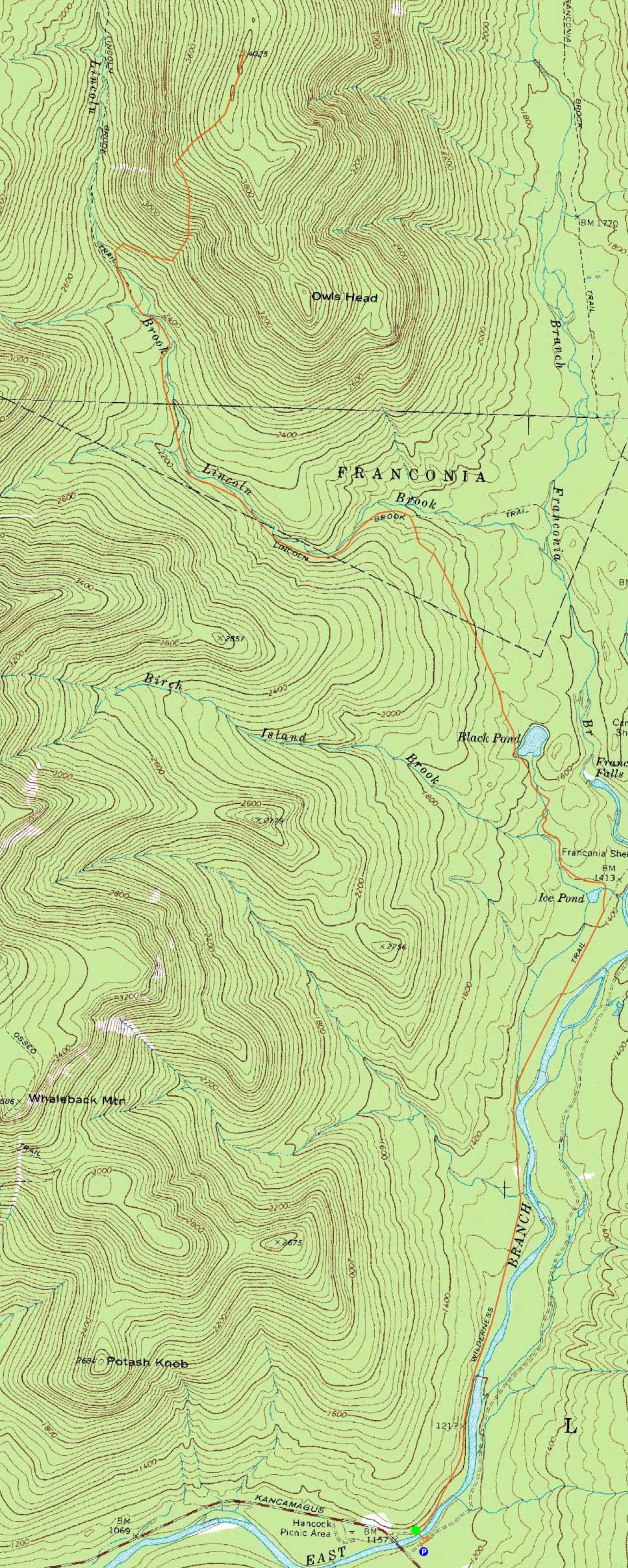 Route: Lincoln Woods Trail, Black Pond Trail, bushwhack, Lincoln Brook Trail, bushwhack, Owl's Head Path, (formerly recognized Owl's Head summit), bushwack, (Owl's Head), buswhack, Owl's Head Path, bushwhack, Lincoln Brook Trail, bushwhack, Black Pond Trail, Lincoln Woods Trail