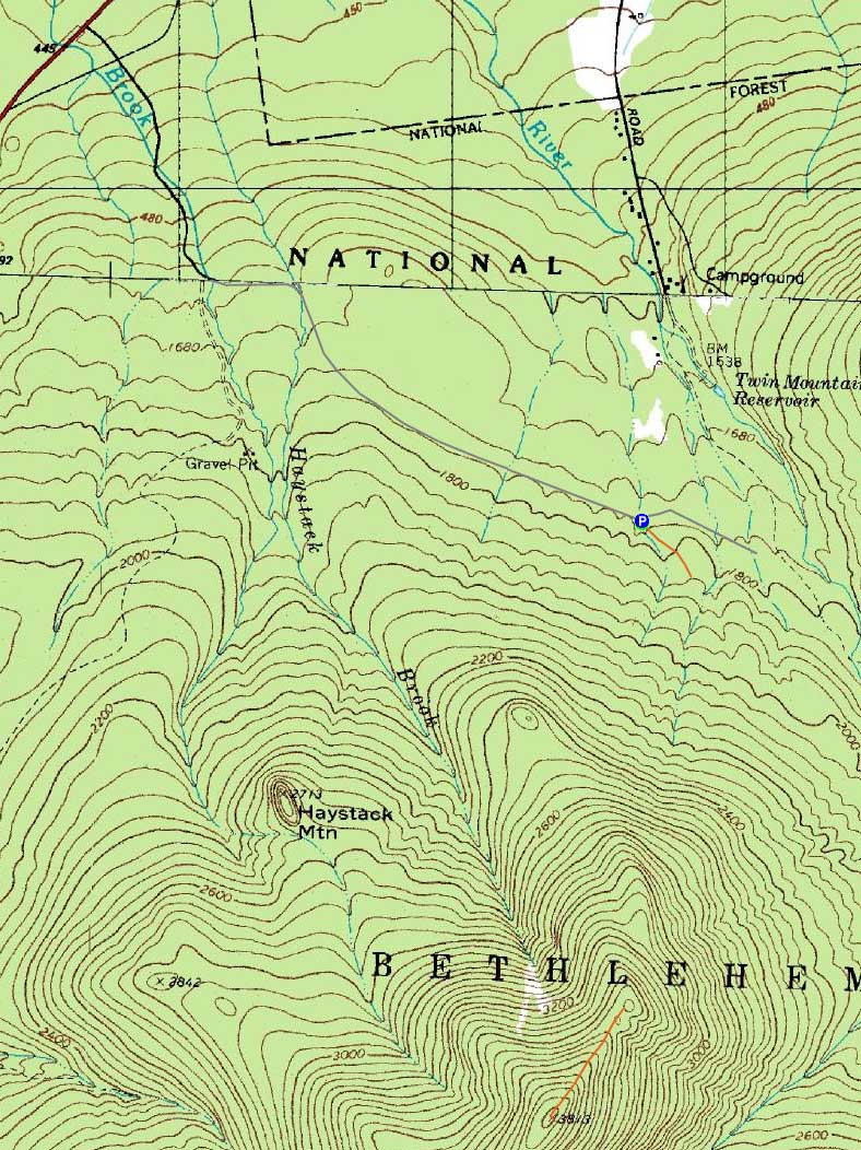 Directions to trailhead: From Route 302, take Route 3 South. Almost immediately after the Entering White Mountain National Forest sign, take a left onto Haystack Road. Forest Road eventually 304A forks off to the right from this road in about 1 3/4 miles, blocked by three large boulders.