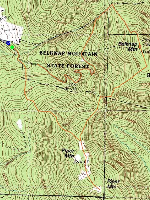 Route: Piper Mountain Trail, green blazed trail, (Piper Mountain), green blazed trail, Old Piper Trail, White Trail, (Belknap Mountain), Blue Trail, Carriage Road