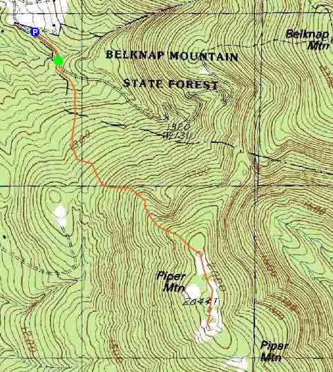 Route: Piper Mountain Trail, green blazed trail, (Piper Mountain), green blazed trail, bushwhack, (Piper Mountain), green blazed trail, Piper Mountain Trail