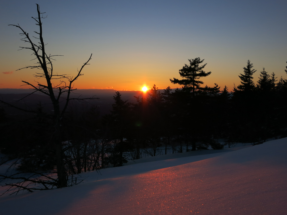 From the stonewall, I broke up to the ridge and to the summit, generally in three to ten inches of new powder (usually around 6-8 inches) with base depths probably around two feet. No sign of any recent traffic from the north. My tracks should set up okay in the sunny ledgy areas.