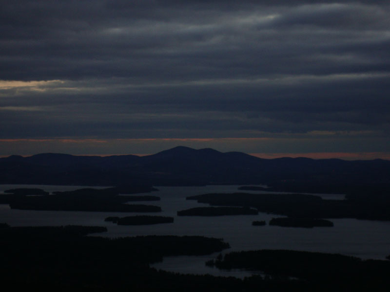 Reaching the windy summit, there wasn't much in way of sunset colors - just some faint reds behind the Belknaps. The higher peaks of the Sandwich Range were hidden in some heavy clouds.