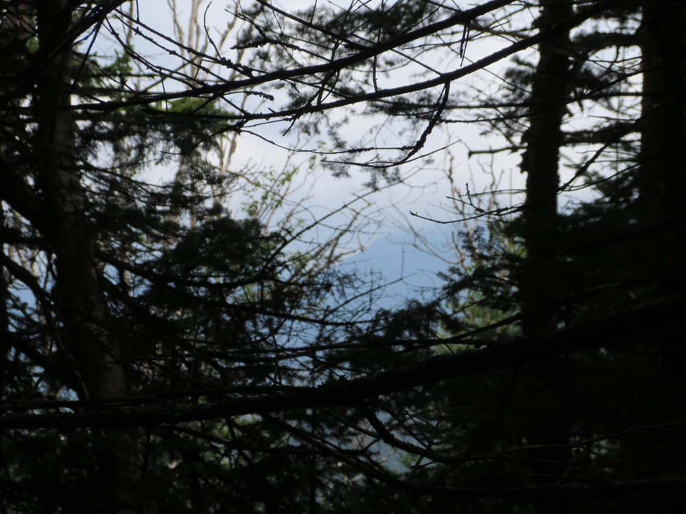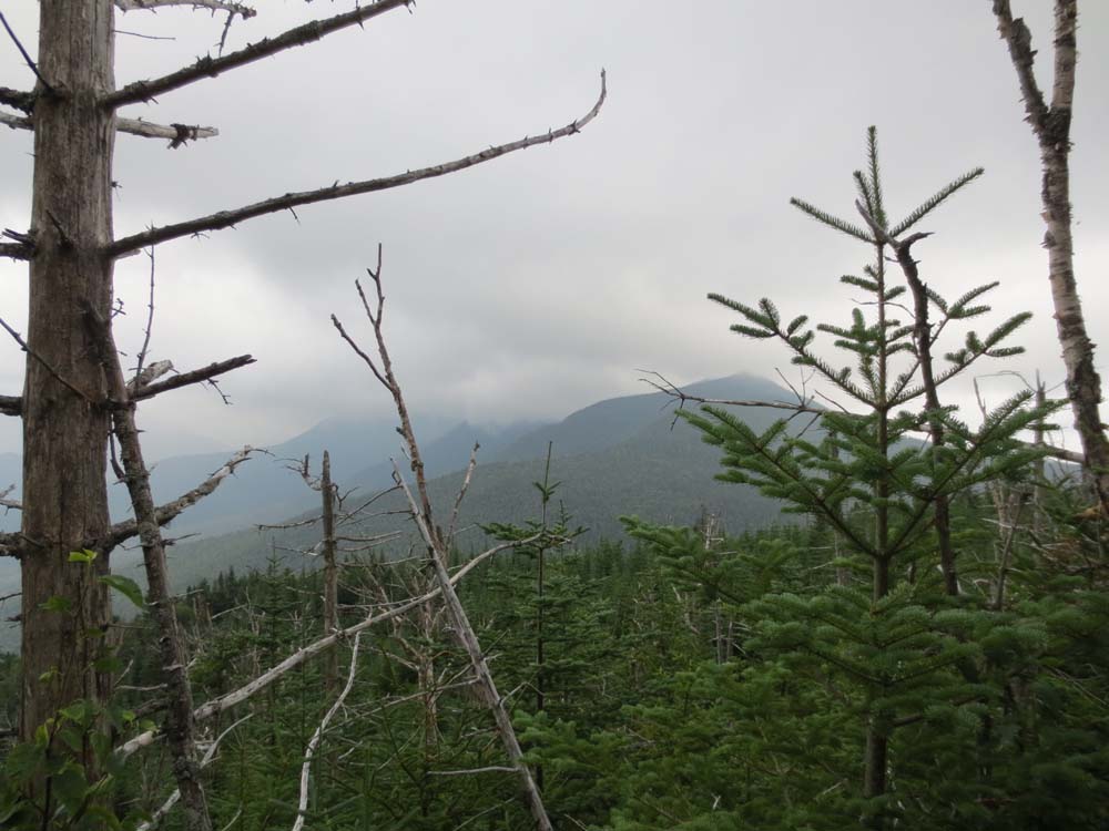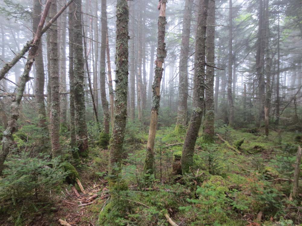 Descent intially was herdpathy, but then became very thick and steep for awhile. Eventually hit an old logging road, which we used for a good 15 minutes until we hit some nice hardwoods briefly. Then, climbed over a small ridge (back into spruce) and went due east to hit the East Pond Trail at maybe 2700 feet. Smooth sailing from there out.