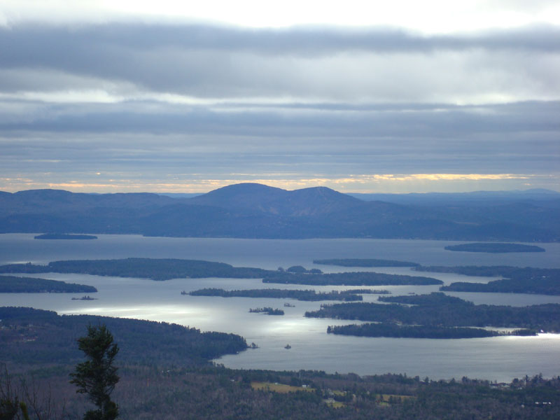 Looking at Lake Winnipesaukee (in the distance under the clouds) from the ledges of Sentinel Mountain