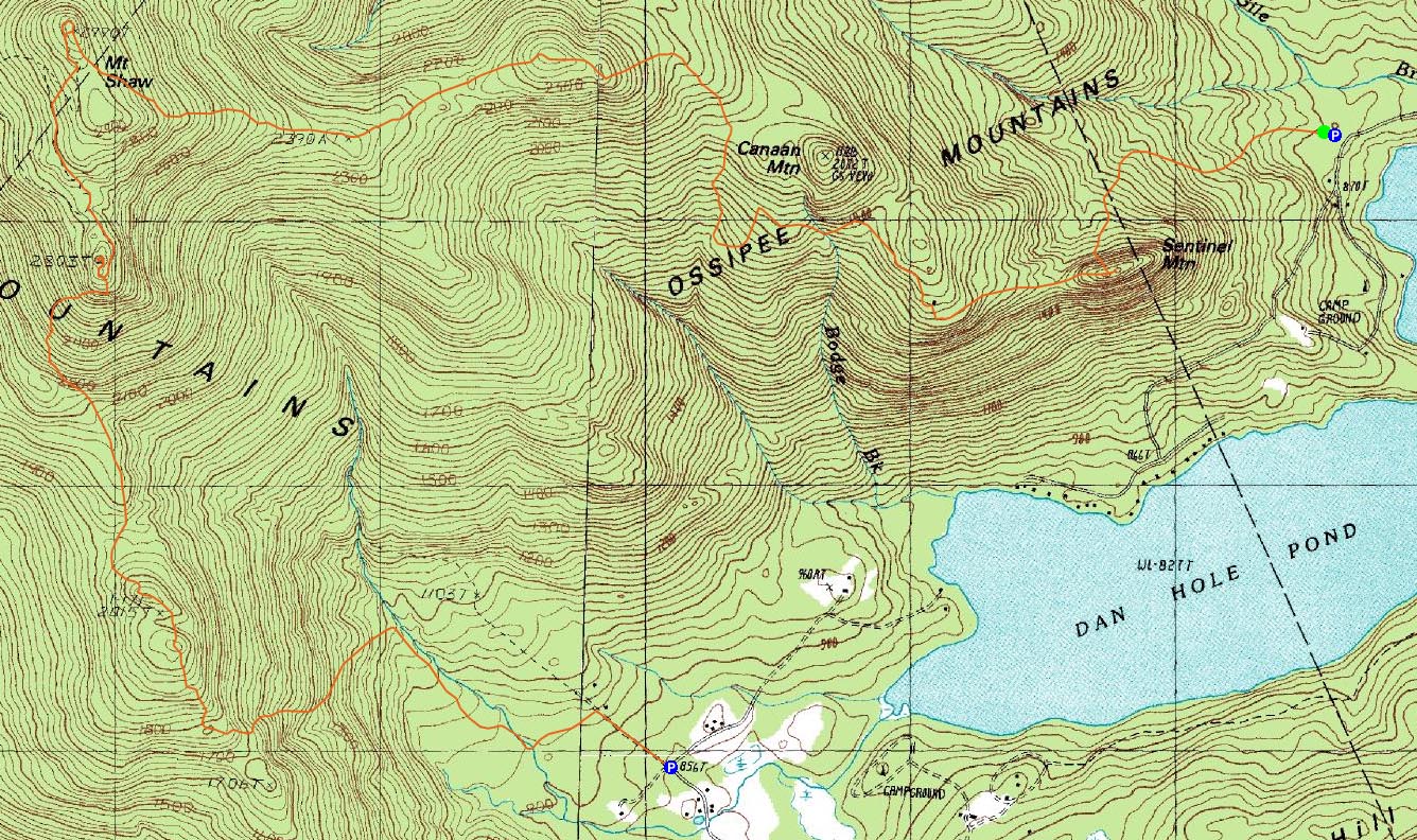 Directions to trailhead: From Route 16 South in West Ossipee, take a left onto Old NH 16. After crossing under Route 16, take a right onto Folsom Road. Once in Center Ossipee, take a right onto Moultonville Road. A few minutes later, take a right onto Valley Road. Look for the entrance to Terrace Pines Campground, which will be on the right when Valley Road forks. Shortly down this road, take a right (immediately before a sign for the office). There is limited room for parking in front of the gate - do not block the gate. The Mountain Trail starts a few dozen feet beyond the gate, on the left. The Big Ball Mountain Trail (Banana Trail) ends on McDuffee Road. There is limited room to park along Canaan Road junction.