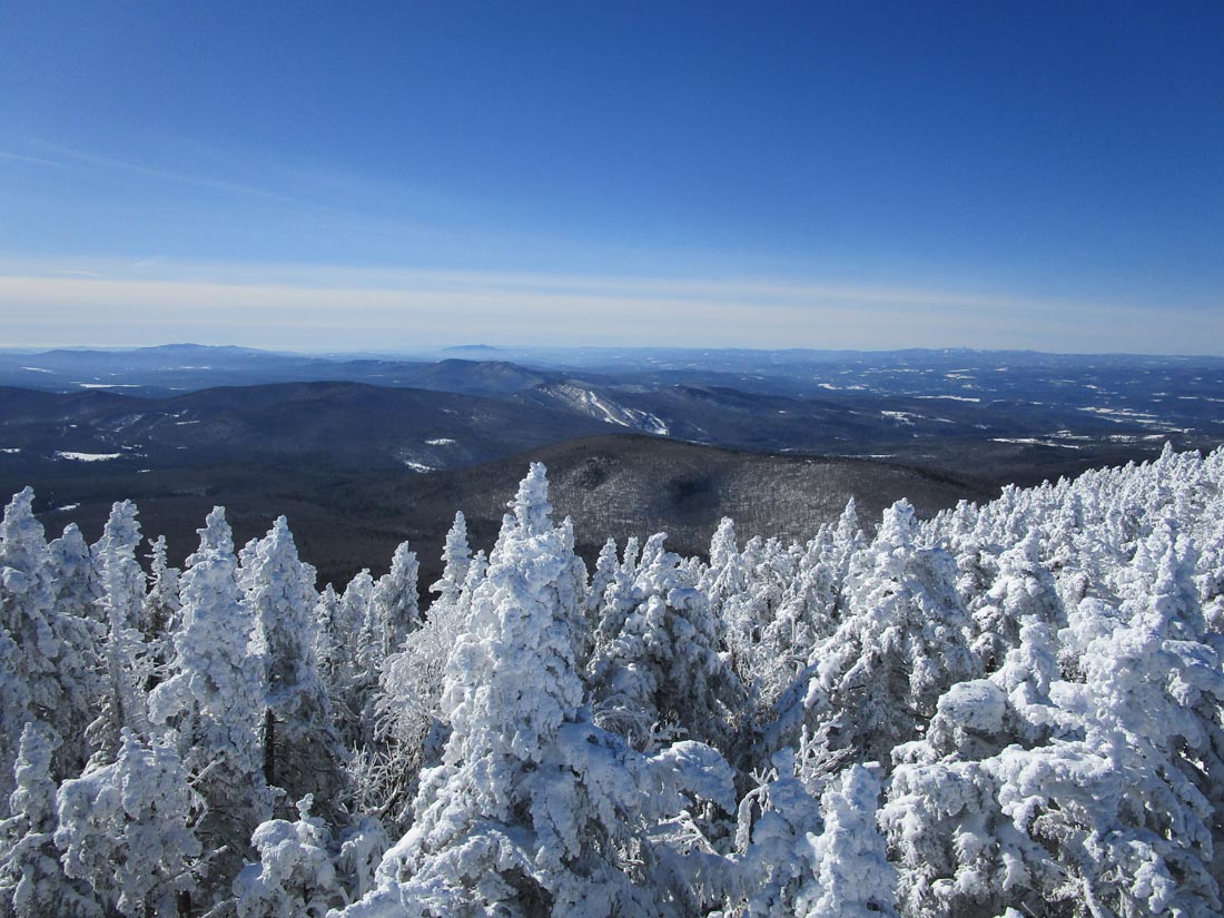 Tower steps are caked in snow/rime, but could be barebooted. I opted not to go into the cab, as the windows were rimed over. Really strong views with some atmospheric distortion on the Ossipees and Sunapee.