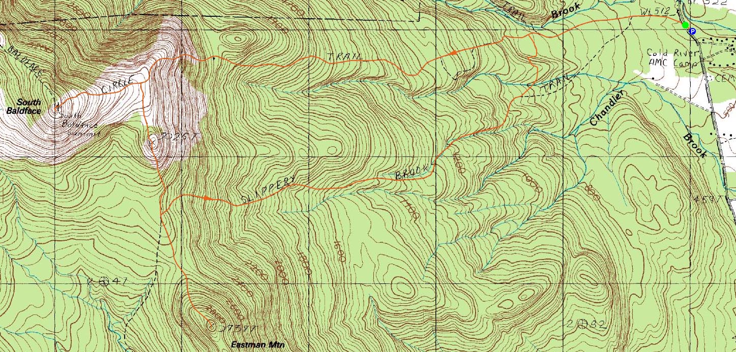 Route: Baldface Circle Trail, (South Baldface), Baldface Circle Trail, Baldface Knob Trail, (Baldface Knob), Baldface Knob Trail, Eastman Mountain Trail, (Eastman Mountain), Eastman Mountain Trail, Slippery Brook Trail, Baldface Circle Trail