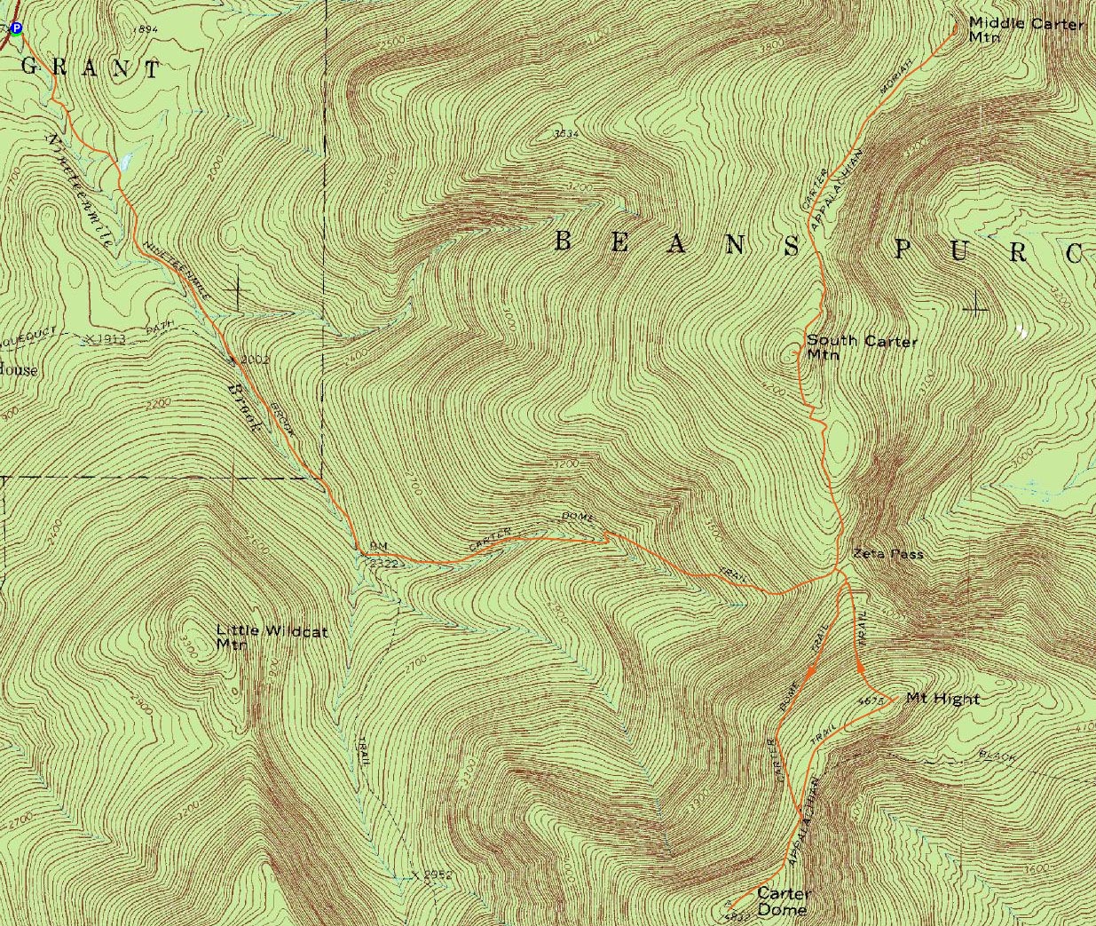Route: Nineteen Mile Trail, Carter Dome Trail, Carter-Moriah Trail, (South Carter Mountain), Carter-Moriah Trail, (Middle Carter Mountain), Carter-Moriah Trail, (South Carter Mountain), Carter-Moriah Trail, Carter Dome Trail, Carter-Moriah Trail, (Carter Dome), Carter-Moriah Trail, (Mt. Hight), Carter-Moriah Trail, Carter Dome Trail, Nineteen Mile Trail