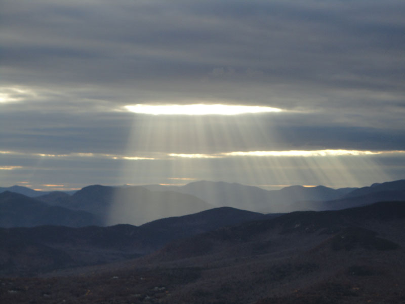 Starting at the trailhead, I jogged and hiked my way up the ski trail, which was muddy in the flat places. I then generally hiked up the steep Old Path, then worked my way over to South Doublehead. Though dark due to the clouds, the views from the northern ledge were nonetheless decent with some interesting sunrays breaking the southern clouds.