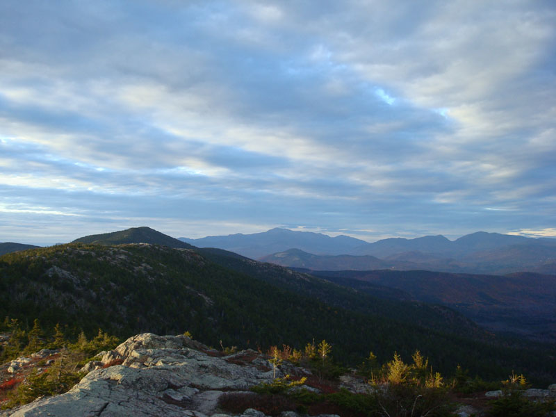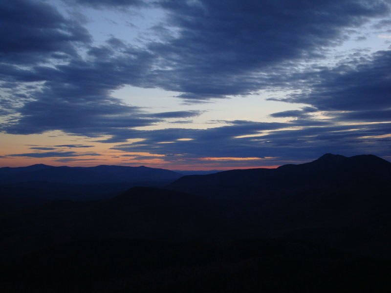 The summit was a bit breezy, but not too cold. The south was almost cloud free, while most other directions were being overtaken by increasingly heavy clouds. As the sun dipped behind the clouds, I could tell there wouldn't be much in way of a spectacular sunset. On the plus side, there were some nice colors to the southwest, between the Ossipees and Mt. Chocorua.