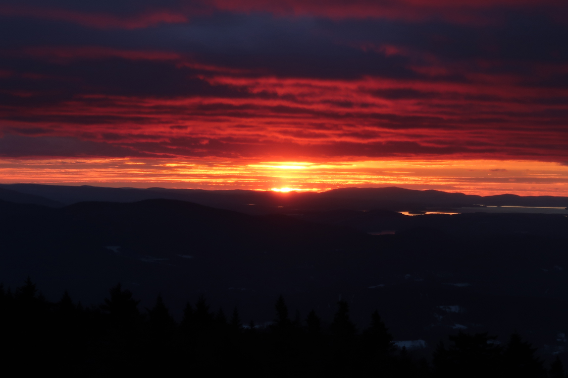 I snowshoed up the lower portion of the hiking trail, which was soft and had a monorail starting to form, but then decided to ascend the more packed snowmobile trail. Still generally wall to wall coverage, but some rocks/seeps/etc. exposed. Decent sunrise, but the wind farm really dominates the view due to the clearing that's been done in recent years.