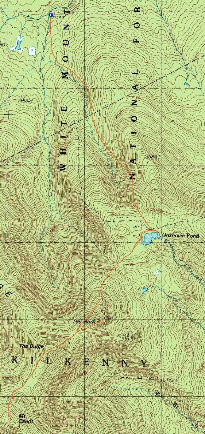 Route: Unknown Pond Trail, Kilkenny Ridge Trail, (The Bulge), Kilkenny Ridge Trail, (Mt. Cabot), Kilkenny Ridge Trail, (The Bulge), Kilkenny Ridge Trail, spur trail, (The Horn), Kilkenny Ridge Trail, Unknown Pond Trail