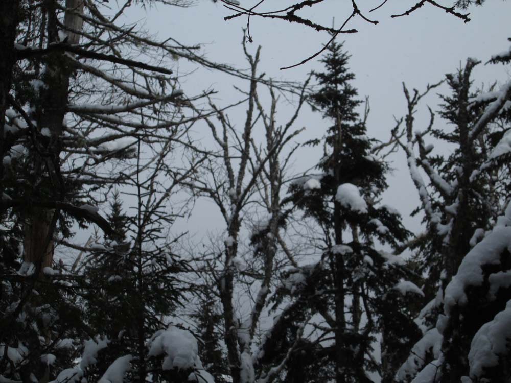 For the bushwhack, we headed sort of straight up the fall line. Snowpack quickly dropped down to maybe an inch or two of powder over ice. Back to half a foot once on the ridge or on the back side of the ridge.