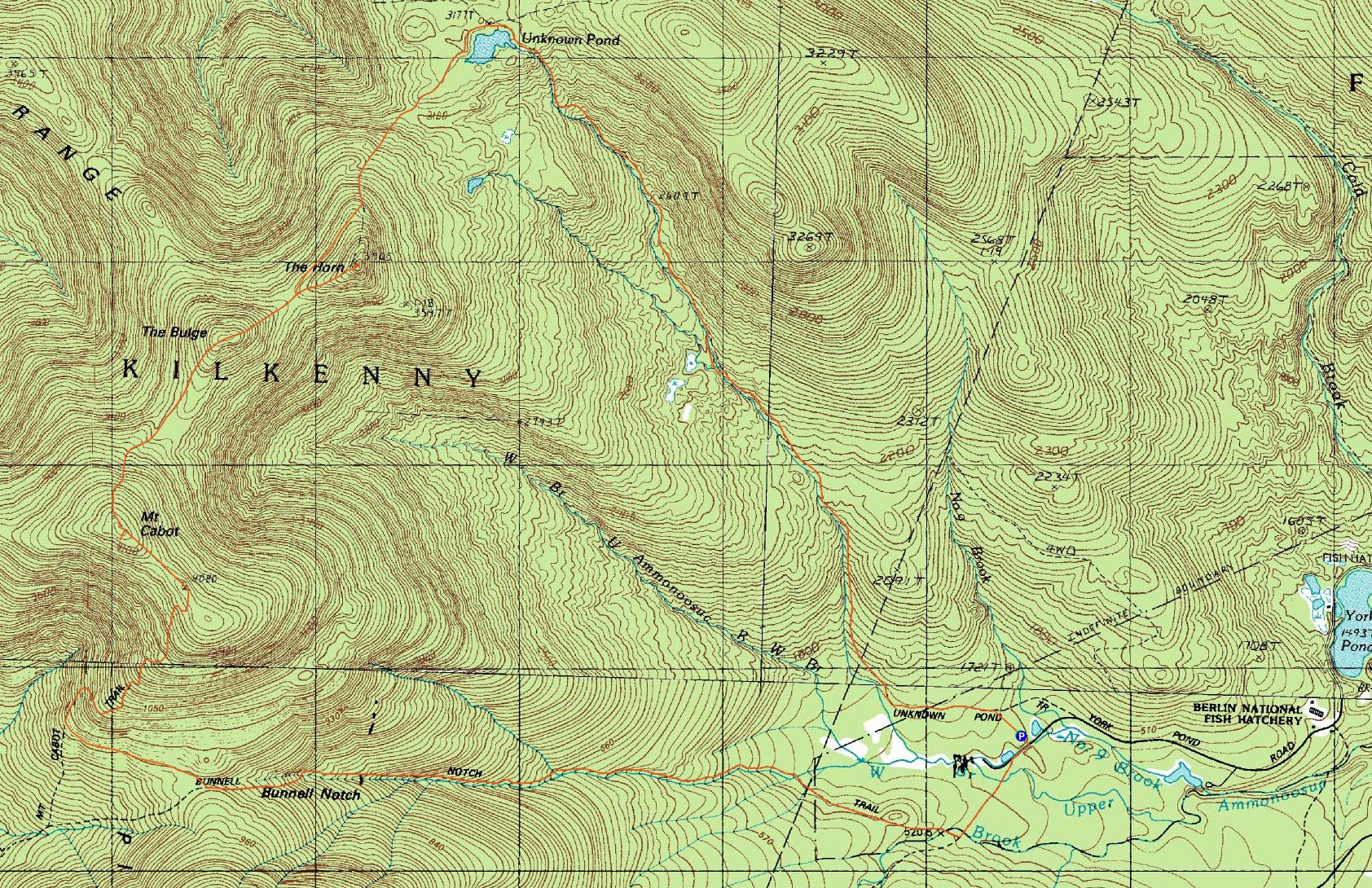 Directions to trailhead: Take Route 16 to Berlin, then take Route 110 northwest. York Pond Road will eventually be on the left. Continue through the Fish Hatchery (do be aware that the gates are only open during the day, usually 8 AM - 4 PM). The driveway to the Unknown Pond Trail parking area will eventually be on the right. The trailhead is next to the kiosk.