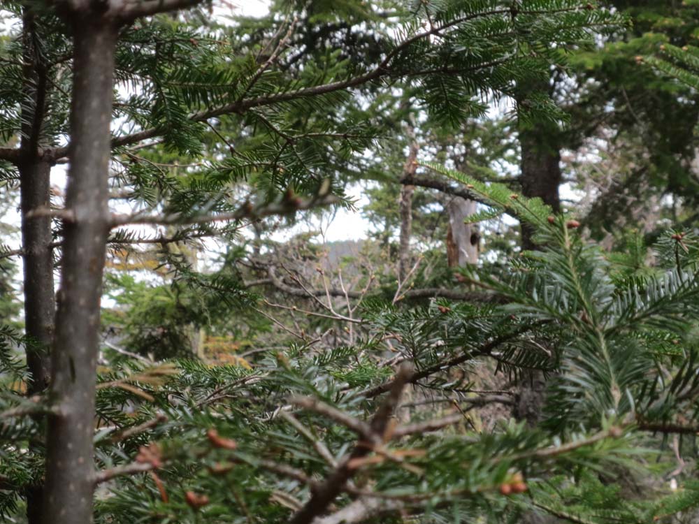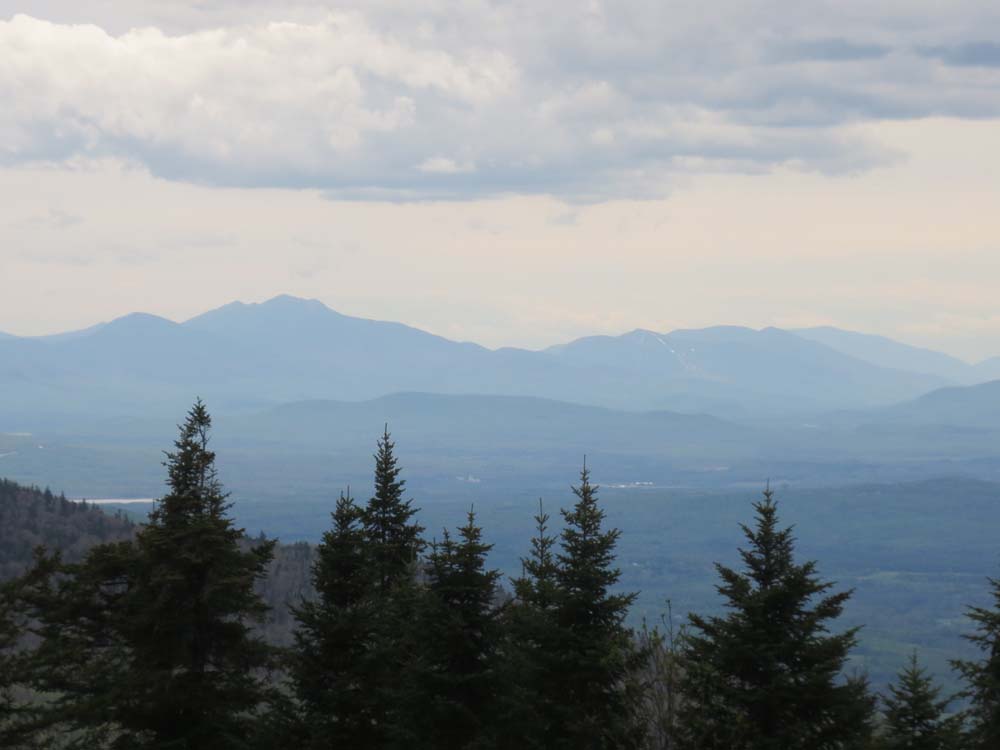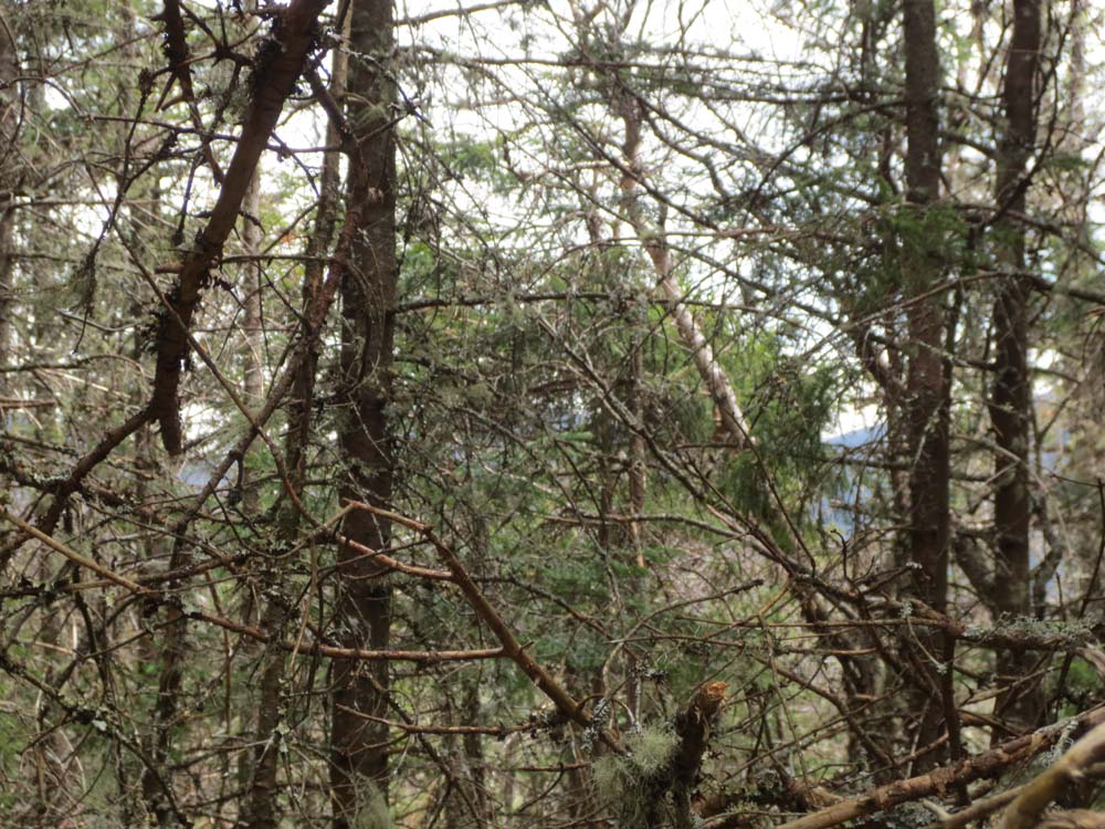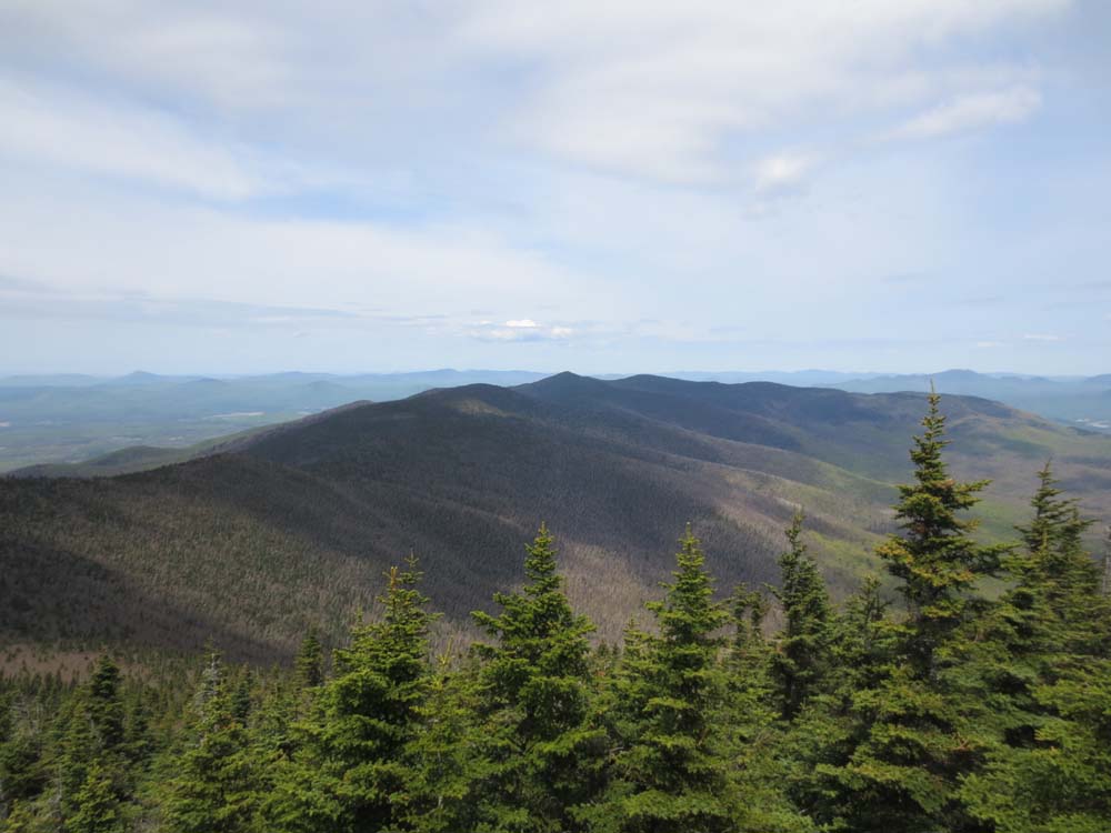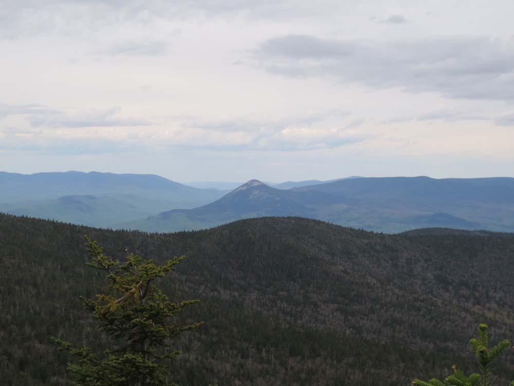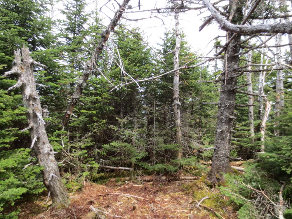 We then continued along the ridge, still in decent woods, to West Pilot. Soon thereafter, the going was less than optimal. We used an old logging road and a herd path on the west side briefly, but then climbed back up to the height of land as to not lose more vertical. Some patches of thick spruce and blowdown and then some patches of open woods. A little bit of a cliff band to navigate prior to Hutchins proper. Decent directional view northeast from near the recognized summit.