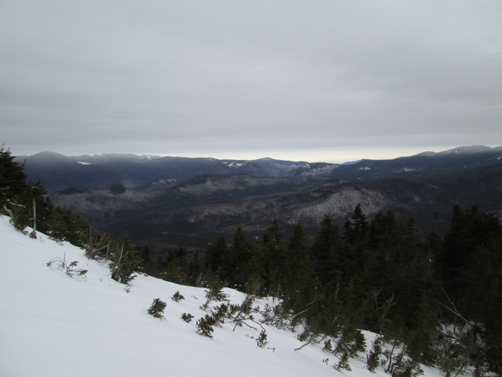 Deeming a descent via that route to be too risky, we instead descended into the col headed toward Carrigain (on the side of which there is a spectacular scree field with excellent views). Relatively smooth sailing from Vose to the col. Occasional pockets of rubbish woods below it with some open areas. Short stretch of good going on a brookbed, then we climbed up into the open woods below Vose and dropped back to the Carrigain Notch Trail.