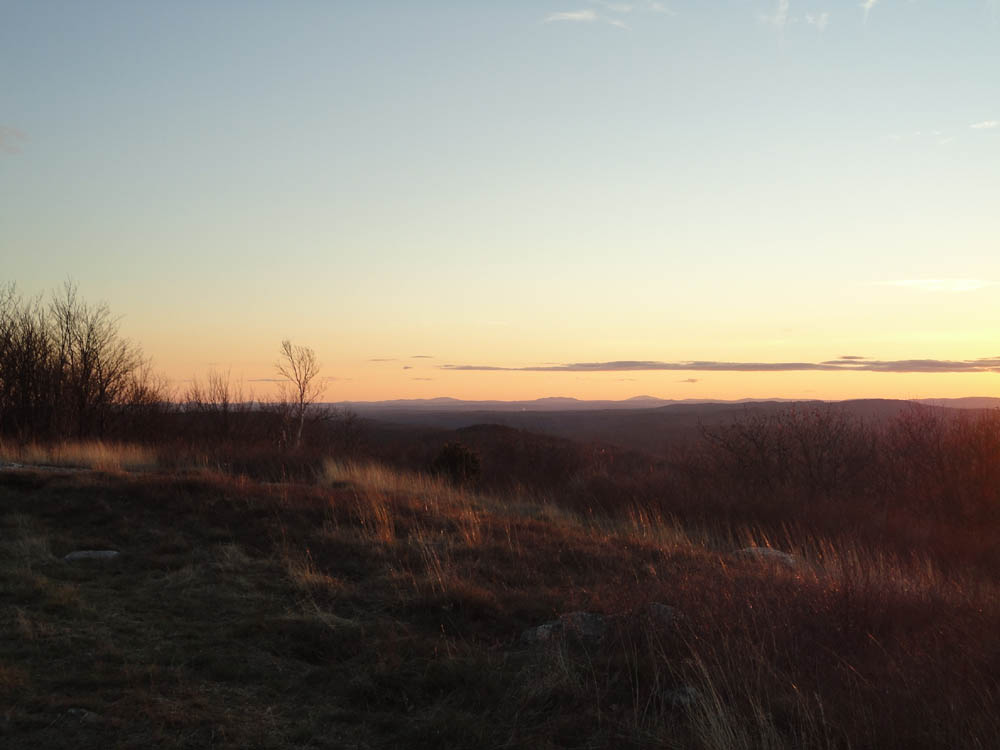 Reaching the summit, there was a decent display setting up. The low fall sun angle helped enhance the set, casting nice light on adjacent peaks (while a near-full moon climbed above the treetops).