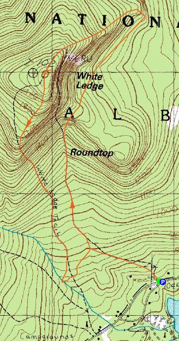 Directions to trailhead: From Chocorua Village, take Route 16 North past the White Ledge Campground. The White Ledge Trail trailhead will be on the left, opposite the northern junction of Pine Knoll Road. As of spring 2009, the trailhead sign is missing, though a 'Campground Ahead' sign is still there. There is limited room to park on the shoulder of Route 16 northbound, just beyond the trailhead.