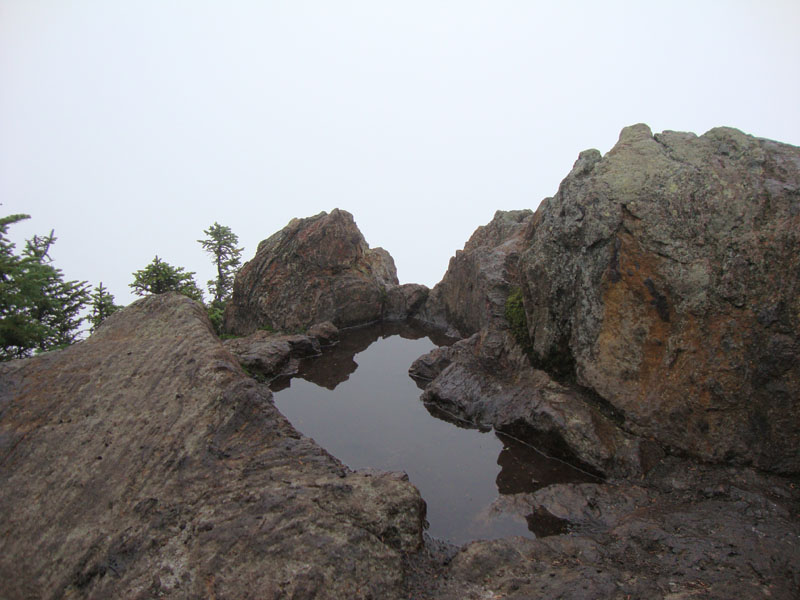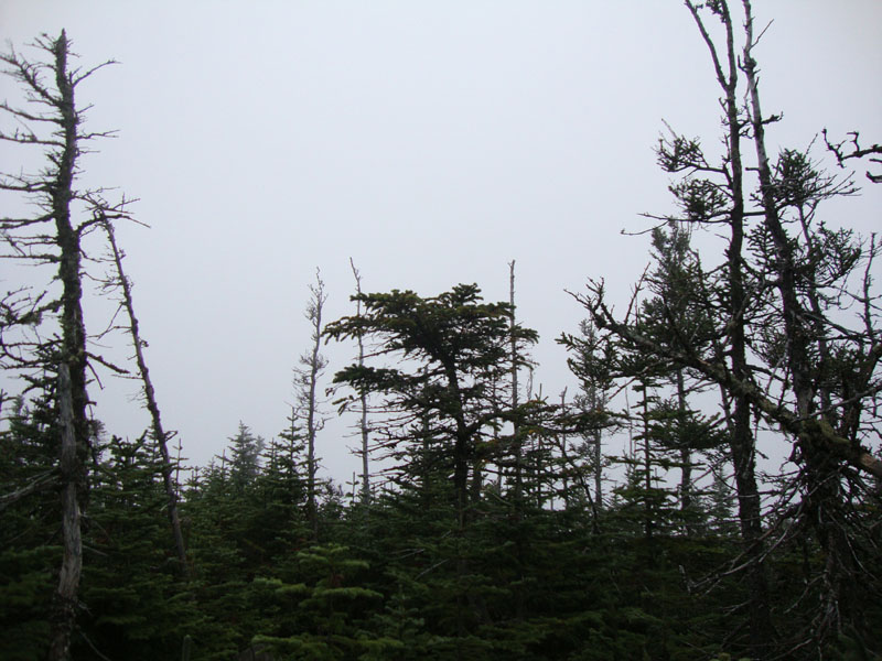 Heading across the ridge, the trail was extremely grown in in places, as well as muddy in others. Unfortunately, we were in the fog for the entire ridge walk, resulting in no views from the peaks.
