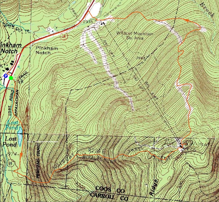 Directions to trailhead: Take Route 16 North from Jackson to Pinkham Notch. The Pinkham Notch Visitor Center and parking lots are on the left, shortly before Wildcat Ski Area. The Lost Pond Trail trailhead is located directly across Route 16 from the parking area.