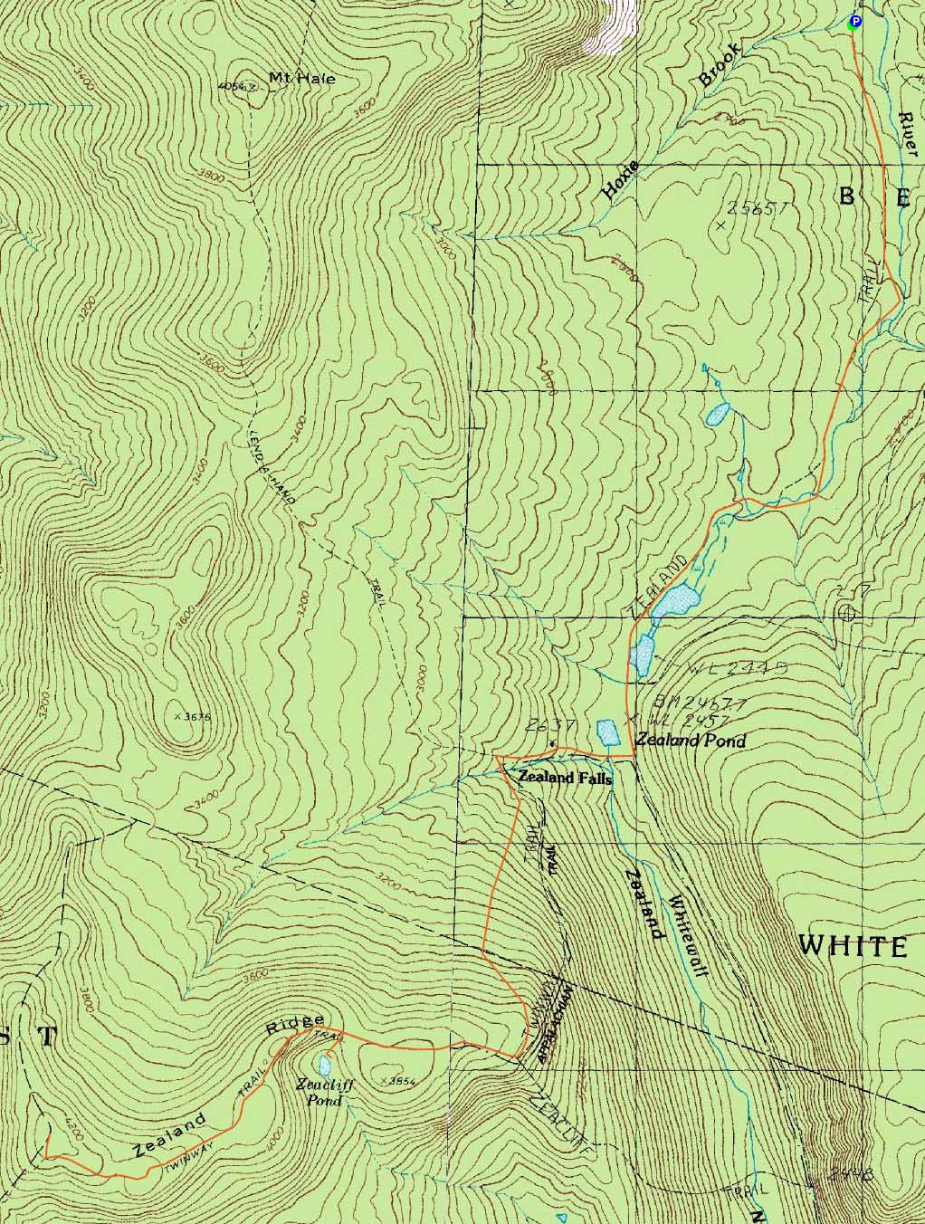 Route: Zealand Trail, Twinway, Zealand Spur, (Zealand Mountain), Zealand Spur, Twinway, Zeacliff Pond Spur, (Zeacliff Pond), Zeacliff Pond Spur, Twinway, Zealand Trail