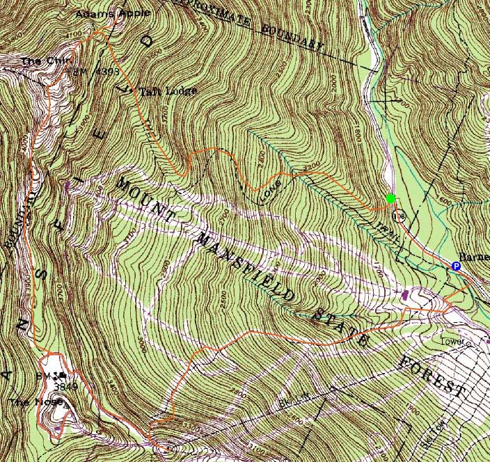 Route: Route 108, Long Trail, Adams Apple Trail, (Adams Apple), Adams Apple Trail, Long Trail, (The Chin), Long Trail, auto road, unknown trail, (The Nose), unknown trail, auto road, ski trails