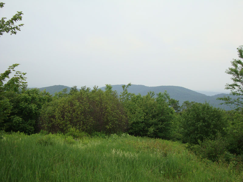 Nearing the grassy summit, the trail rejoined a grassy road. The summit area featured hazy views in multiple directions - I suspect it would be a really nice place to visit on a crisp, late autumn day. While I probably found the highpoint on the north knob of the summit, I didn't bother to bushwhack to the actual highpoint on the southern knob (perhaps about 14 feet taller).