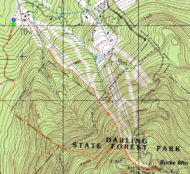 Route: Red Trail, Summit Trail, (Burke Mountain), unknown trail, ski trails