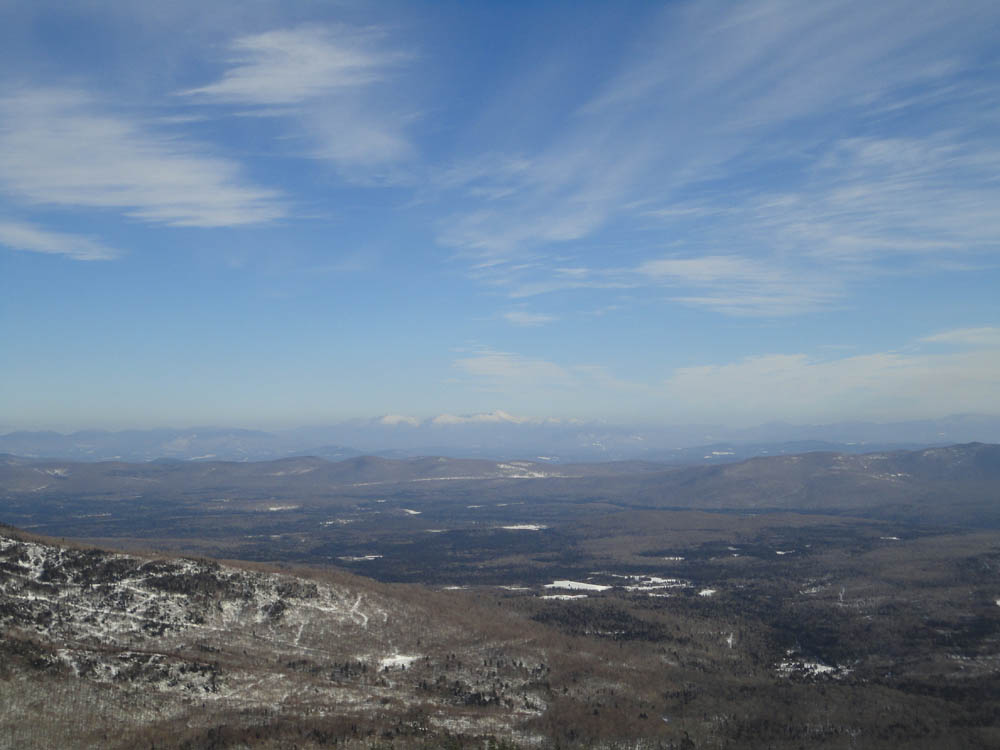 Reaching the summit, I took off my snowshoes and climbed up the stairs of the very tall fire tower. From the cab, I had superb views in all directions, including the Presidentials and Willoughby Gap.