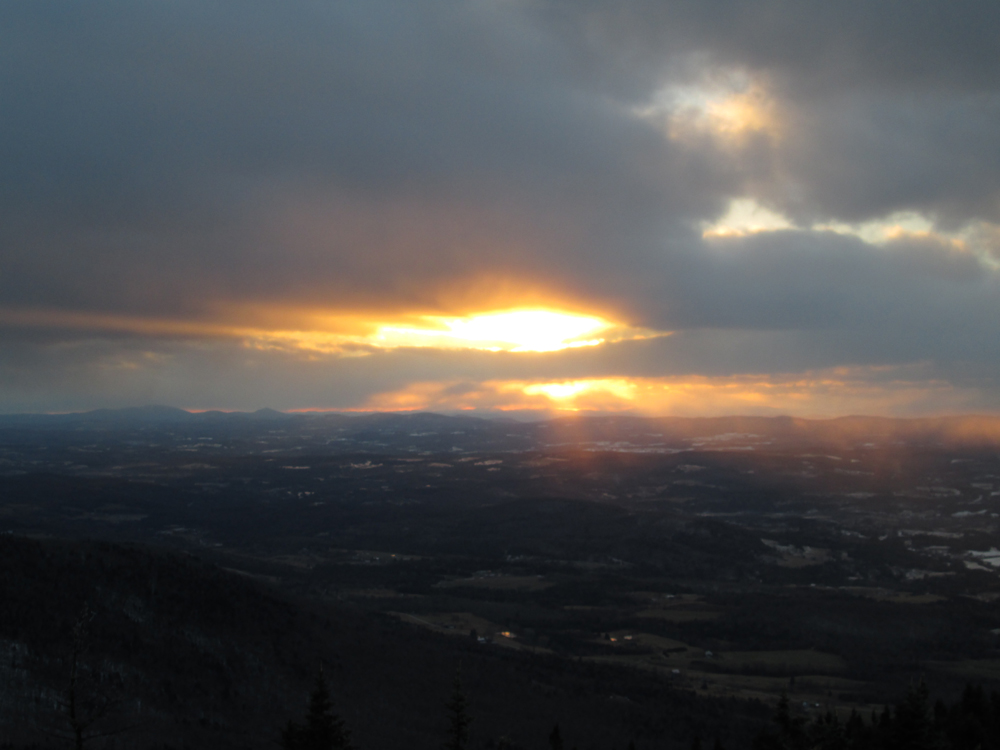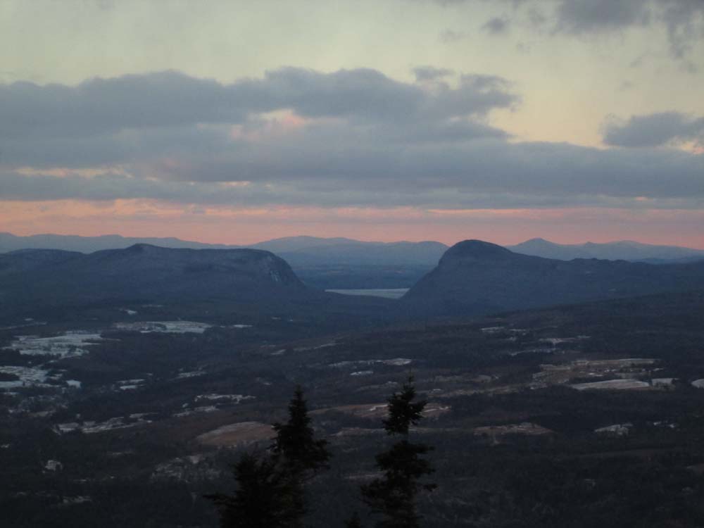 Hoping to catch post sunset colors, I made a side trip to the West Peak. There was about 3-4" of crunchy snow in the small col, followed by blue and black ice on the footbed. A western snow flurry blocked any color, but it looks like the viewpoint below the shelter would be good for sunsets, especially when the angle from the fire tower is blocked by the communications tower.