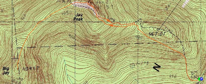 Directions to trailhead: From the town of Jay, take 242 south to the top of the pass. There is a parking lot on the left. The trailhead is just slightly downhill from this, on the right.