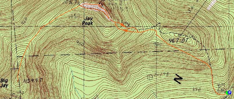 Directions to trailhead: From the town of Jay, take 242 south to the top of the pass. There is a parking lot on the left. The trailhead is just slightly downhill from this, on the right.