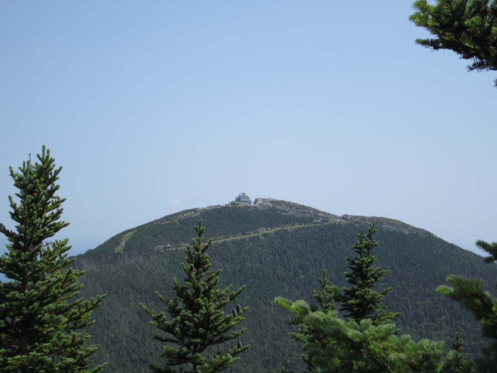 From there up, there was an occasional pocket of thick spruce, as well as some cliffy areas and some mud. One also crosses the Long Trail boundary corridor near the top, which can be seen on the aerial photo dropping down the east slope.