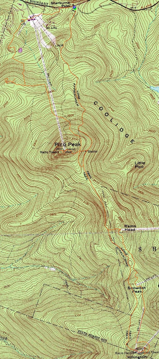 Directions to trailhead: Take Route 4 West from the main Killington entrance. Parking area and trail head will be at the top of the pass on the left.