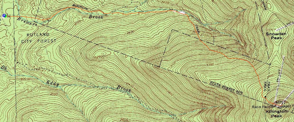 Route: Bucklin Trail, Long Trail, Killington Spur, (Killington Peak), spur trail, (Killington ski area summit), spur trail, (Killington Peak), Killington Peak, Long Trail, Bucklin Trail