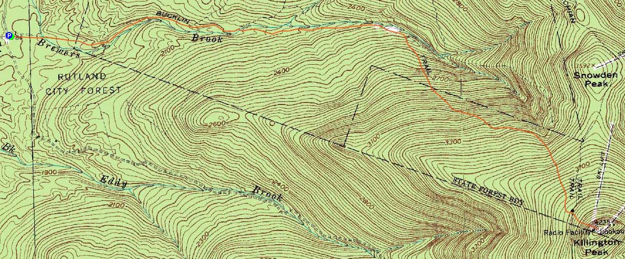 Directions to trailhead: To get to the Bucklin Trail trailhead, take US 4 West from Pico Ski Area. A few minutes downhill, on a right curve, take a left onto Wheelerville Road. The Bucklin Trail parking area will be on the left after few miles on this road at a sharp right turn. The Bucklin Trail starts at the back of this parking lot.
